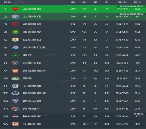 中超第29轮结束了所有比赛,最新积分榜如下!