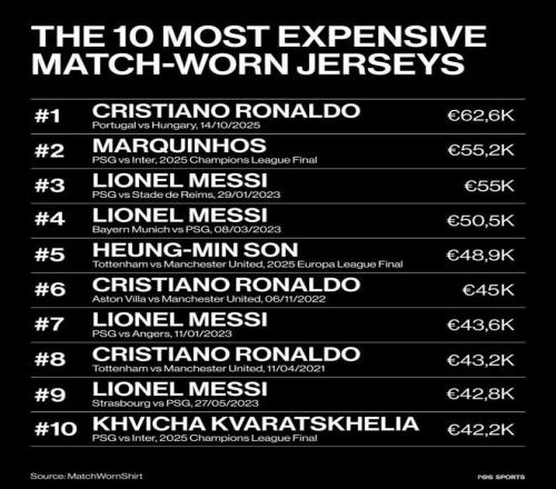 最近Match WornShirt联合NSS Sports发布了一份“历史最贵比赛实战球衣TOP10”榜单,说的不是年薪、不是代言费,而是单件球衣在拍卖平台上的最终成交价。这些球衣都是真正在正式比赛里穿过的实战战袍,一件就能被炒到几十万欧元,最贵的甚至接近63万欧元,上榜的有梅西、C罗、孙兴慜等人。到底是一件球衣本身值这个价,还是被比赛意义和球星光环一起抬上去的,你可以边看排名边自己下判断。
