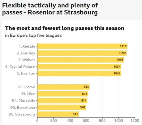 事实上,斯特拉斯堡只有511次长传,低于其他五大联赛球队,排名倒数第二位的巴萨则有598次长传,切尔西的长传次数则高达925次。